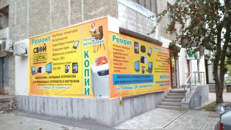 Сервисный сентр Свой сервис, расположенный по адресу ул. Победы, 32, Орджоникидзевский район, микрорайон Уралмаш, Екатеринбург предлагает следующие услуги: ремонт микроволновых печей (свч), ремонт мобильных устройств и гаджетов, ремонт смартфонов, ремонт телефонов, ремонт планшетов, ремонт gps навигаторов, ремонт электронных книг, ремонт аудио и видео, ремонт телевизоров, ремонт автомагнитол, ремонт видеокамер, ремонт акустических систем, ремонт видеорегистраторов, ремонт аудиоплееров, ремонт компьютерной техники, ремонт ноутбуков, ремонт компьютеров, ремонт жестких дисков, ремонт игровых приставок, ремонт мониторов, ремонт материнских плат, ремонт сетевого оборудования, ремонт фотоаппаратов. Время работы сервиса: пн-пт 10:00–20:00; сб,вс 10:00–19:00.